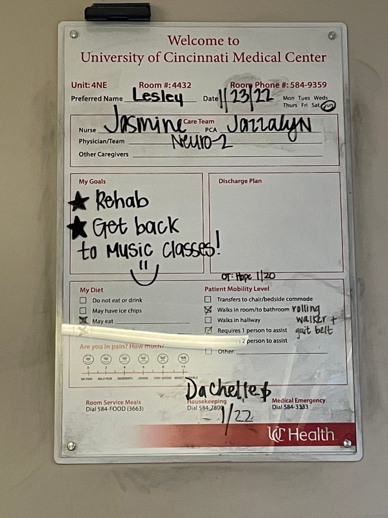 So after roughly a 32 hour stint between the West Chester ED, transport to UC Medical Center in Clifton, and in the ED here waiting on a bed to open up, I landed on 4NE which is the Neurology unit at about 7pm on Tuesday 1/18/22. My nurse that first night was Jasmine and she was wonderful, did what she had to do and let me SLEEP, which is exactly what I needed. Then began the hard work of figuring out exactly what was going on with my body, and how I am going to get better.