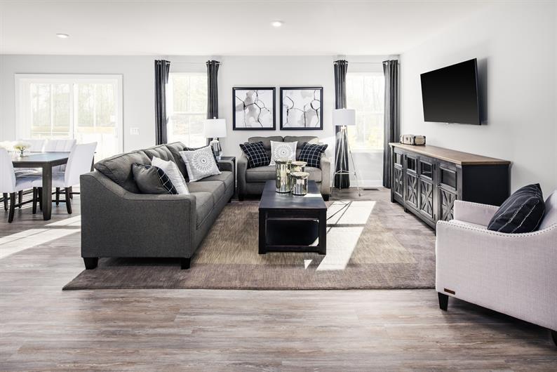 Here are some actual pictures of the model that I saw, which is my color scheme, but a right garage layout. You can see there is a wide open space, and I did opt for all vinyl plank flooring through the main area there, which makes using my wheelchair much easier. I love all the light! This is the same south window exposure at the back of the house that I will have, although my lot has a few mature trees in the yard of the house behind me.