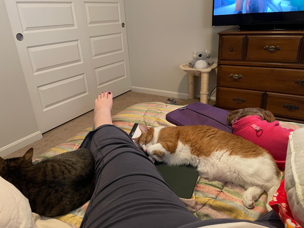 That brings me to the topic at hand. The cats. Marty and Lorraine are settling in well, and Dixie and Lorraine in particular are becoming fast friends, much to all of our joy and consternation. We have mostly figured out the food situation, everyone is getting enough food, Dixie can’t access the wet food which gave her some loose poop, but it is a communal kibble free for all right now. This understandably not the best situation, but it is hard to resolve as Dixie has been a “free” grazer for her entire life. When I retreat to my bedroom, we often have a “slumber party” where I end up with all three of them snoozing on the bed. Keeping the peace is not about them.