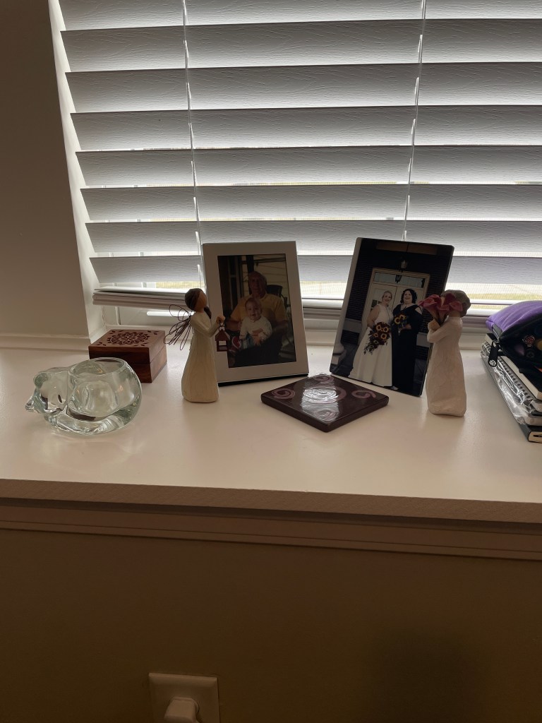 I also cleared off the clutter and added some nice little figurines and some pictures. One of myself and my maternal grandfather when I was about 6 months old, and one of my sister and myself on her wedding day. I also put out my essential oil diffuser, that cycles through lights as a sort of night-light, as I don’t like burning candles around the cats, and all of my wax melters are packed and in storage. I hope by putting in essential oils like chamomile and “Let it Go” helps change the vibe around here a bit. Maybe I should invest in a salt lamp as well.