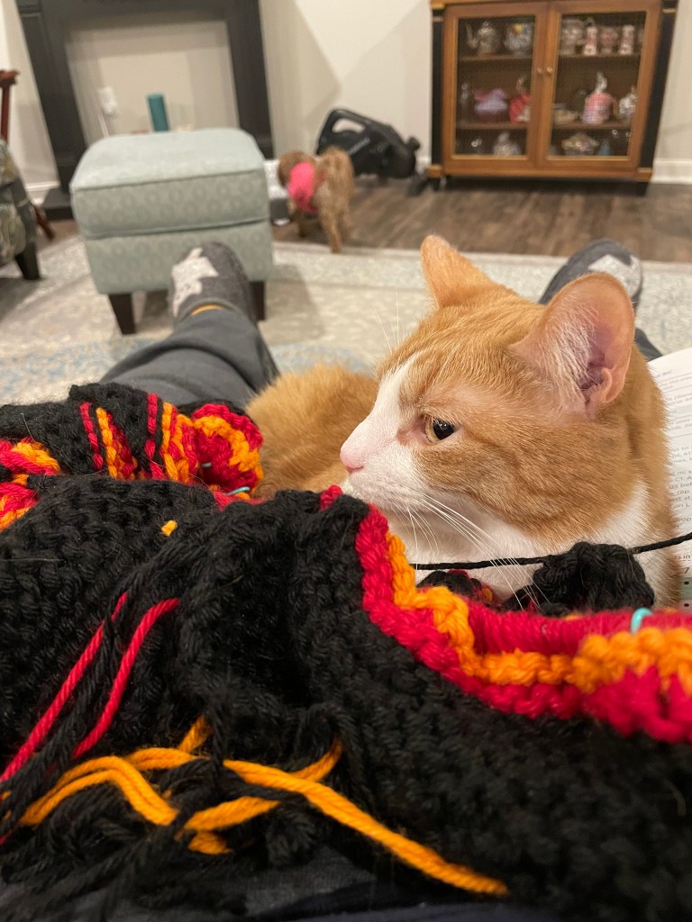 Thursday was a busy day, with both my weekly PT visit and my weekly OT visit. I will be transitioning towards the end of this month to outpatient OT/PT and then I know the real work of getting back to life/work will begin. Mom and I also got out for some hair therapy, brunch and yarn therapy time, since we have Haggis (what I am calling my soon to be Niece/Nephew) to knit for. Dad should be proud, I only bought three skeins of yarn for the project that calls for something specific, and I got out of there for under $30. My yarn/knitting/crochet friends know how rare that is. Not going to say exactly what that project is, but enjoy this picture of Marty being my knitting buddy anyway.