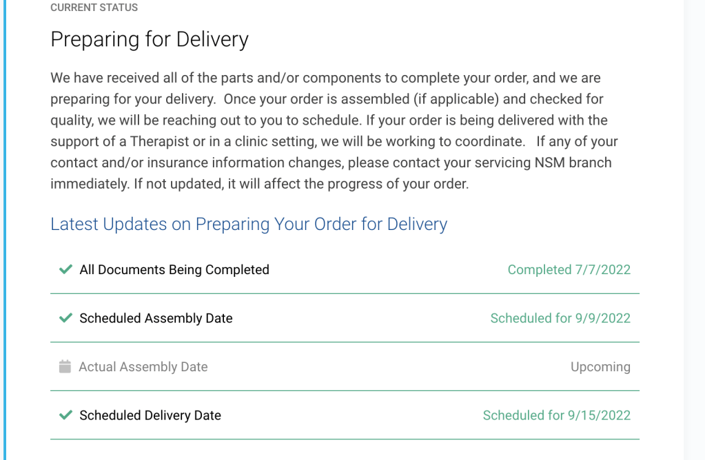 Next is my wheelchair is finally due to be delivered next week. I am low-key excited for this as I will have my own custom to me chair that hopefully fits me better and I can get in and out of the car easier. All of the parts finally came in earlier this week and National Seating and Mobility is working to assemble and deliver my chair by next Thursday. I know they will do a good job.